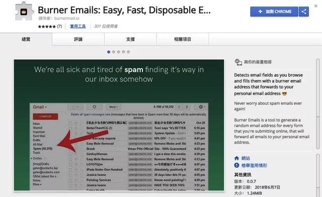 以下使用 Google Chrome外掛進行教學範例。 開啟 Burner Emails外掛頁面,點選右上角的“ 加到 Chrome ”將它下載、安裝到瀏覽器後就能使用。