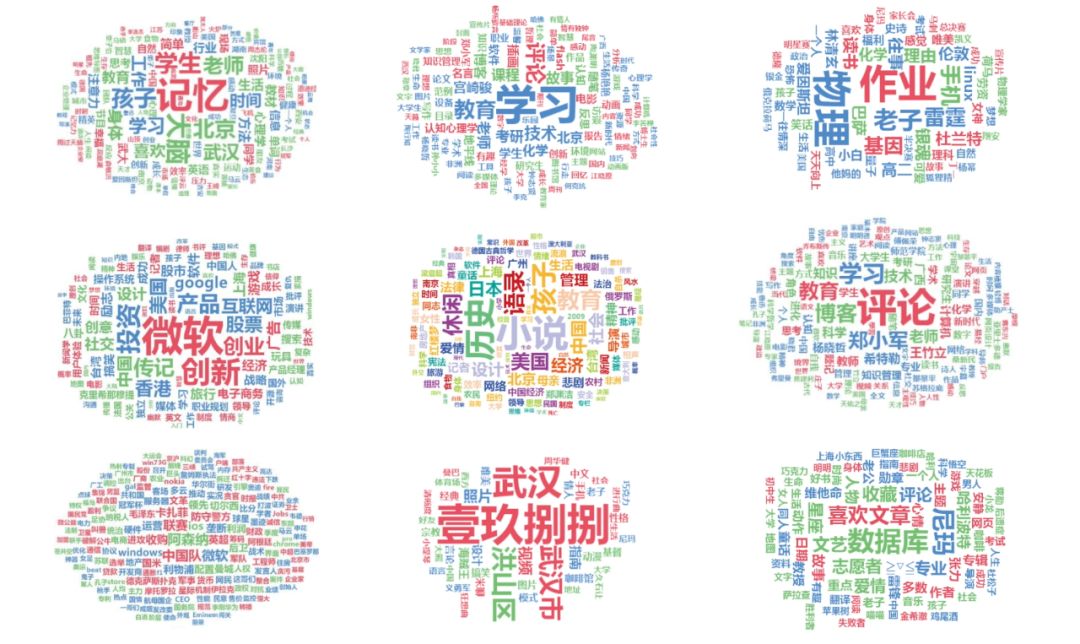通過抓取用戶發送過的微博內容,進行分詞,再去除的、也、了等不攜帶主題信息的高頻停止詞後,統計其他詞語的出現頻率,就能得到每個人的微博關鍵詞 圖譜。 通過圖譜,用戶可以迅速了解自己的狀態、興趣,與他人的關鍵詞相似程度等等。